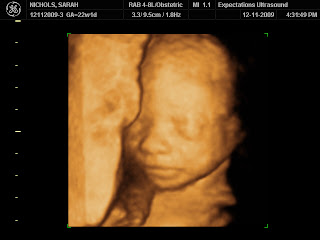I had a 3d/4d ultrasound on Friday at 22 weeks + 1 day! It was absolutely amazing. She quite the activie little girl and the technician was contantly chasing her trying to get good pictures. She cooperated and in a few, I think we got her sucking her thumb! The optimal time for 3d/4d is after 26 weeks but we couldn't wait any longer. We are scheduled to go back at 30 weeks - which will be right around Valentine's Day. At that time, she should be more filled out and we will be able to see more pronounced facial features. She is just now starting to put fat and muscle on her body so she looks pretty skinny. I'm amazed at how strong she is though . . . she can kick and punch like you wouldn't believe. We also bought a device that lets us listent to her heartbeat and hear her kicks. Sometimes she kicks so hard the device bounces on my stomach. It is quite entertaining! I have some videos I am going to post as soon as I figure out how to do that.