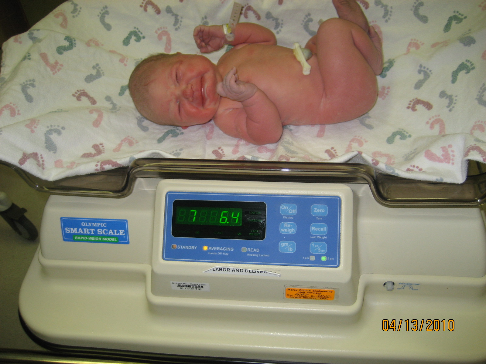 Ella arrived at 4:52 p.m. April 13, 2010 at St. John's Mercy Hospital in St. Louis. She weighed 7 lbs 6 oz and was 20" long. I was admitted on April 12, 2010, to be induced. All was going well until her heart rate began dropping after contractions. This lead to the c-section birth that went smoothly! She is healthy and gaining weight!